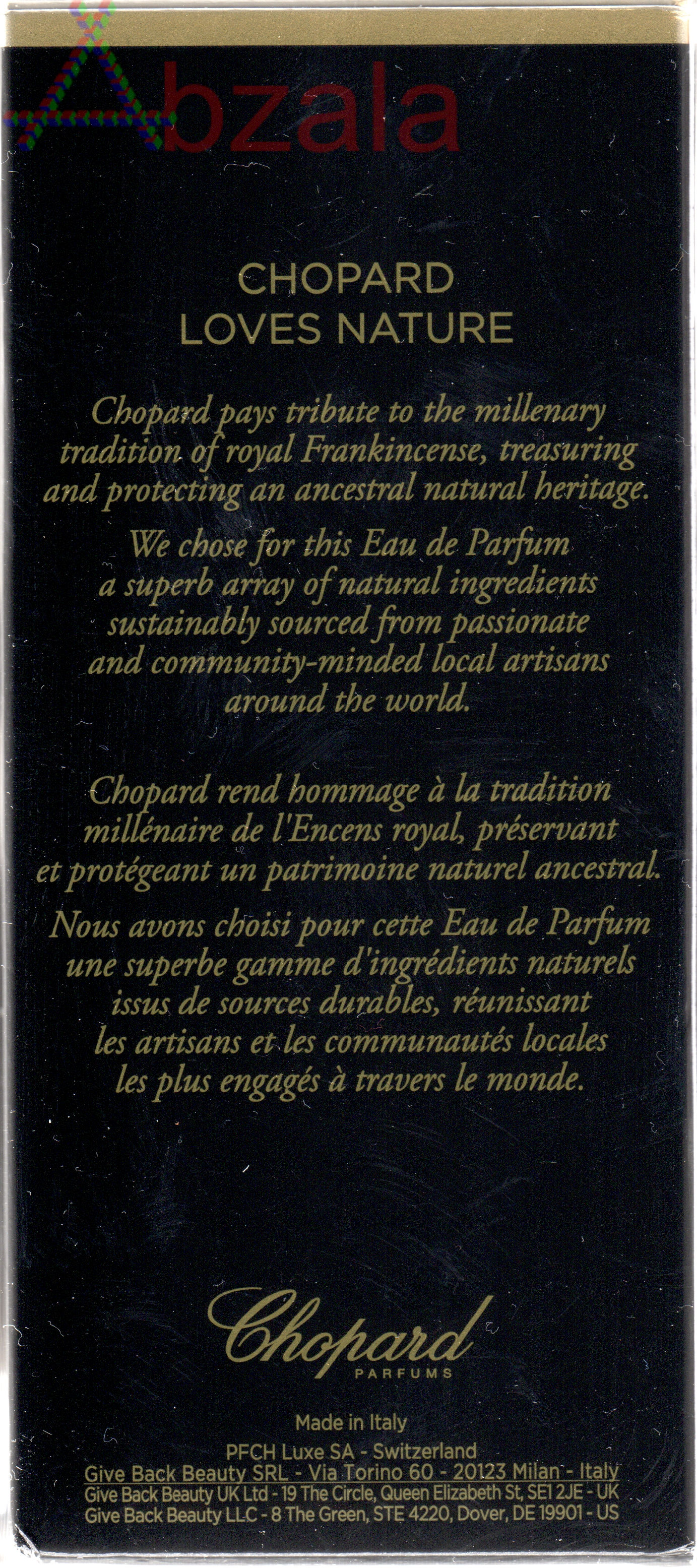 Мало того, что нет никакой гравировки лазером или фрезой на флаконе, так и на наклейке ничего нет. Я очень удивился, когда ни в одном ролике обзоров не было показана нижняя часть флакона. После такой презентации, если бы у меня даже были деньги на ювелирные изделия от Chopard, я бы ни за что их не купил.