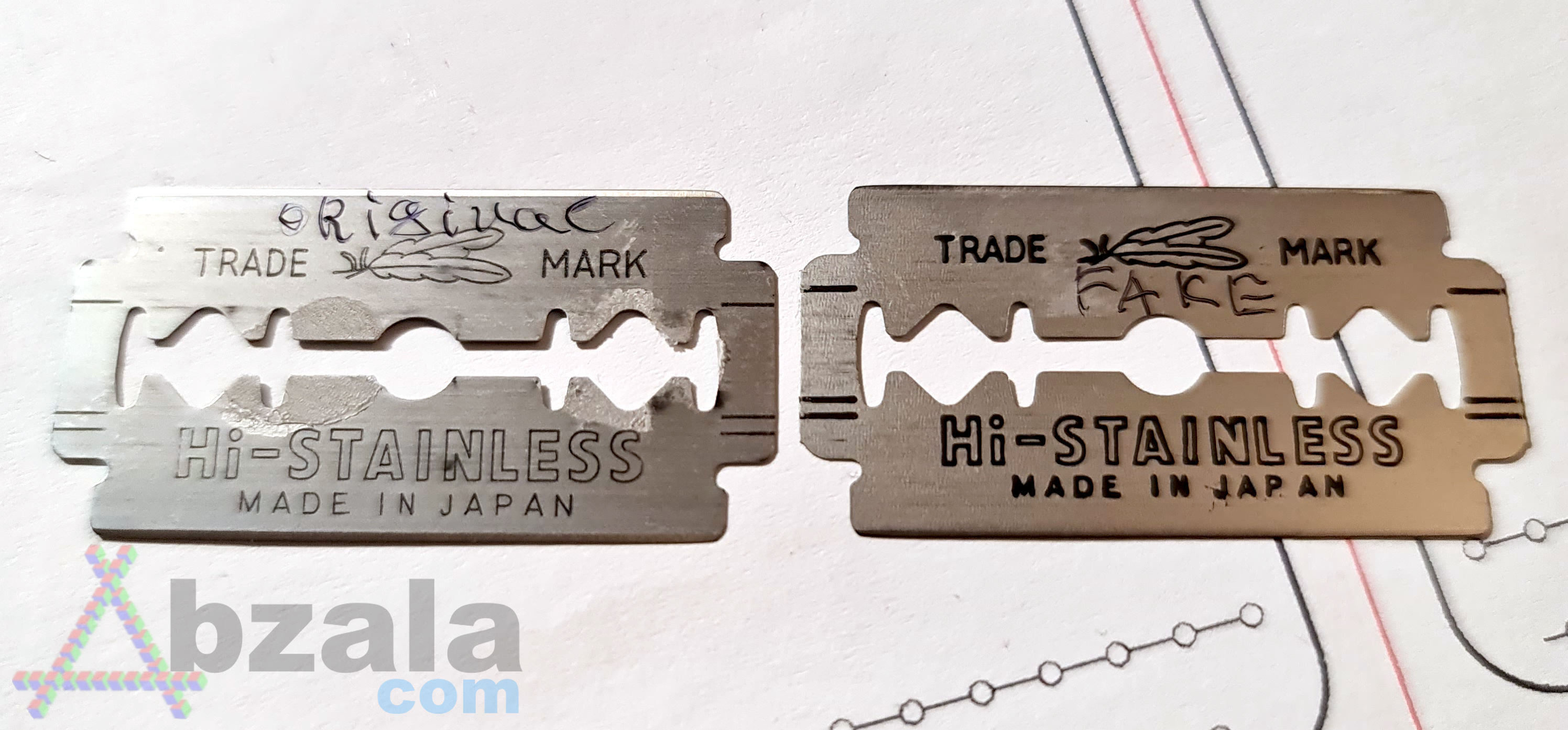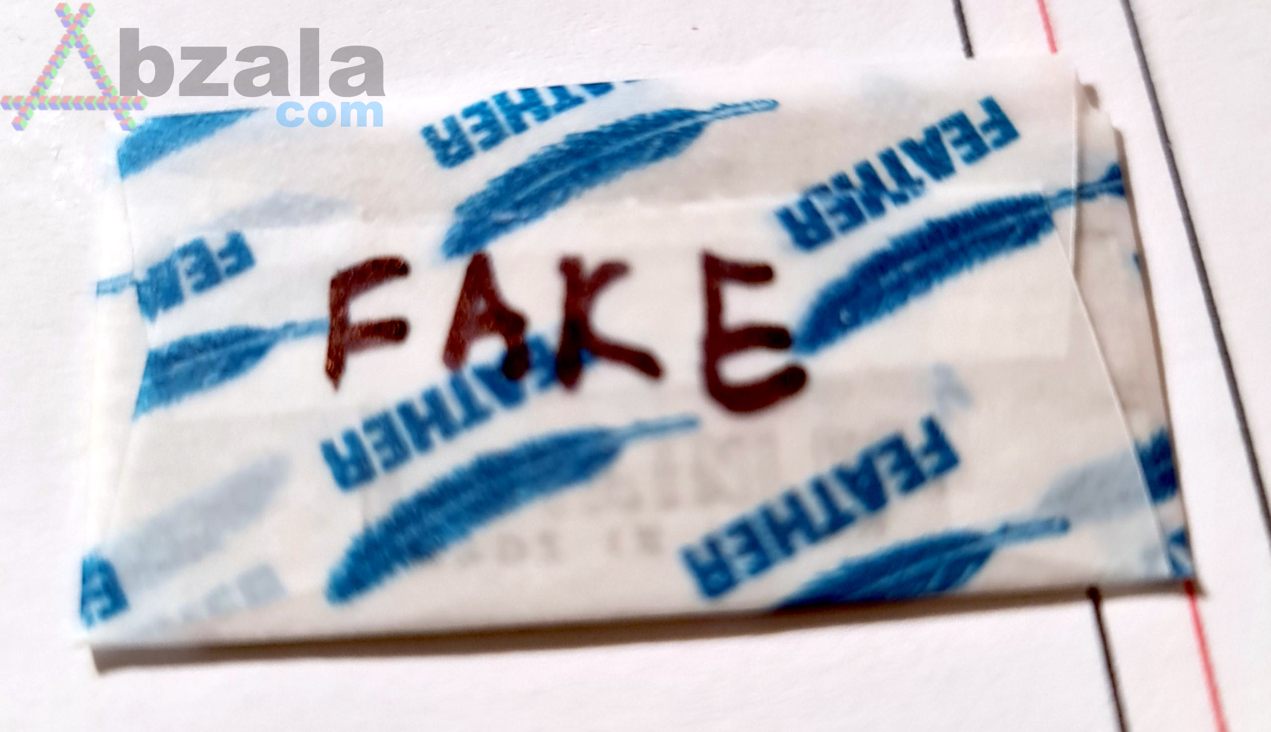 A comparison of original and counterfeit Feather blades. The writing and design on the counterfeit are bolder than on the original. Also, the counterfeit blade has a space after the letter "P" in the word "Japan," while the original blade is written as one word.