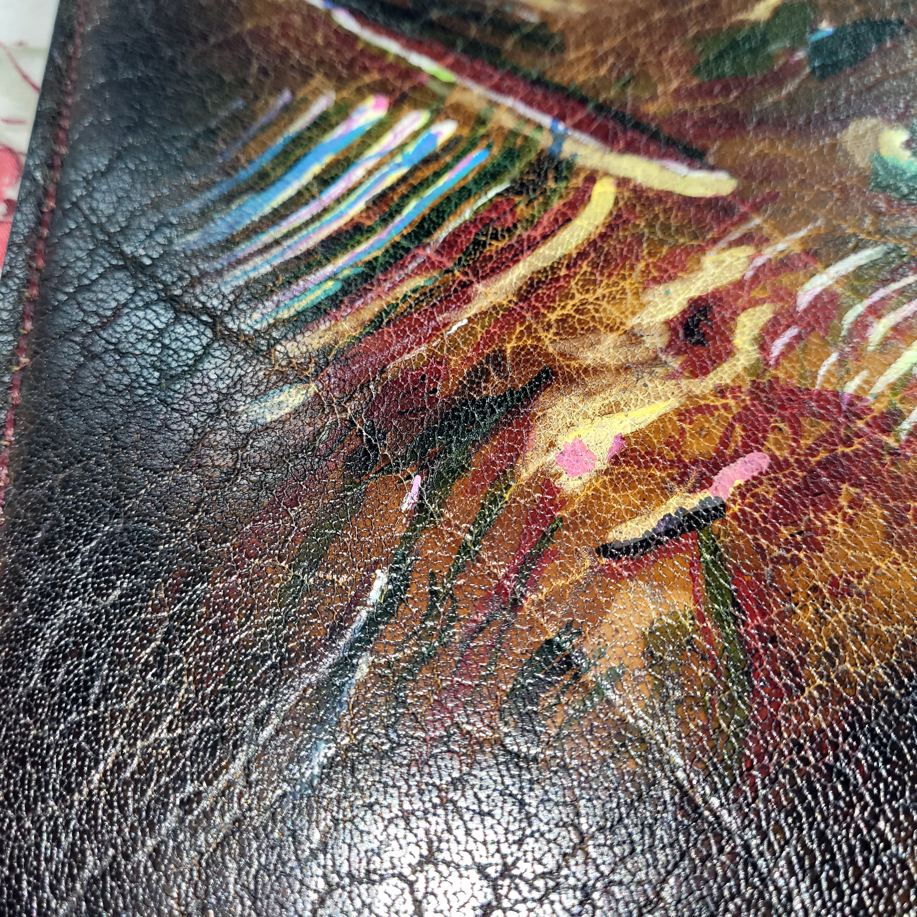 Hand painted. Completely handmade. Unique juicy, large texture of natural adult buffalo leather, 4 millimeters thick, made in Spain. Lining: genuine saffiano leather, 1 mm thick, made in Turkiye.