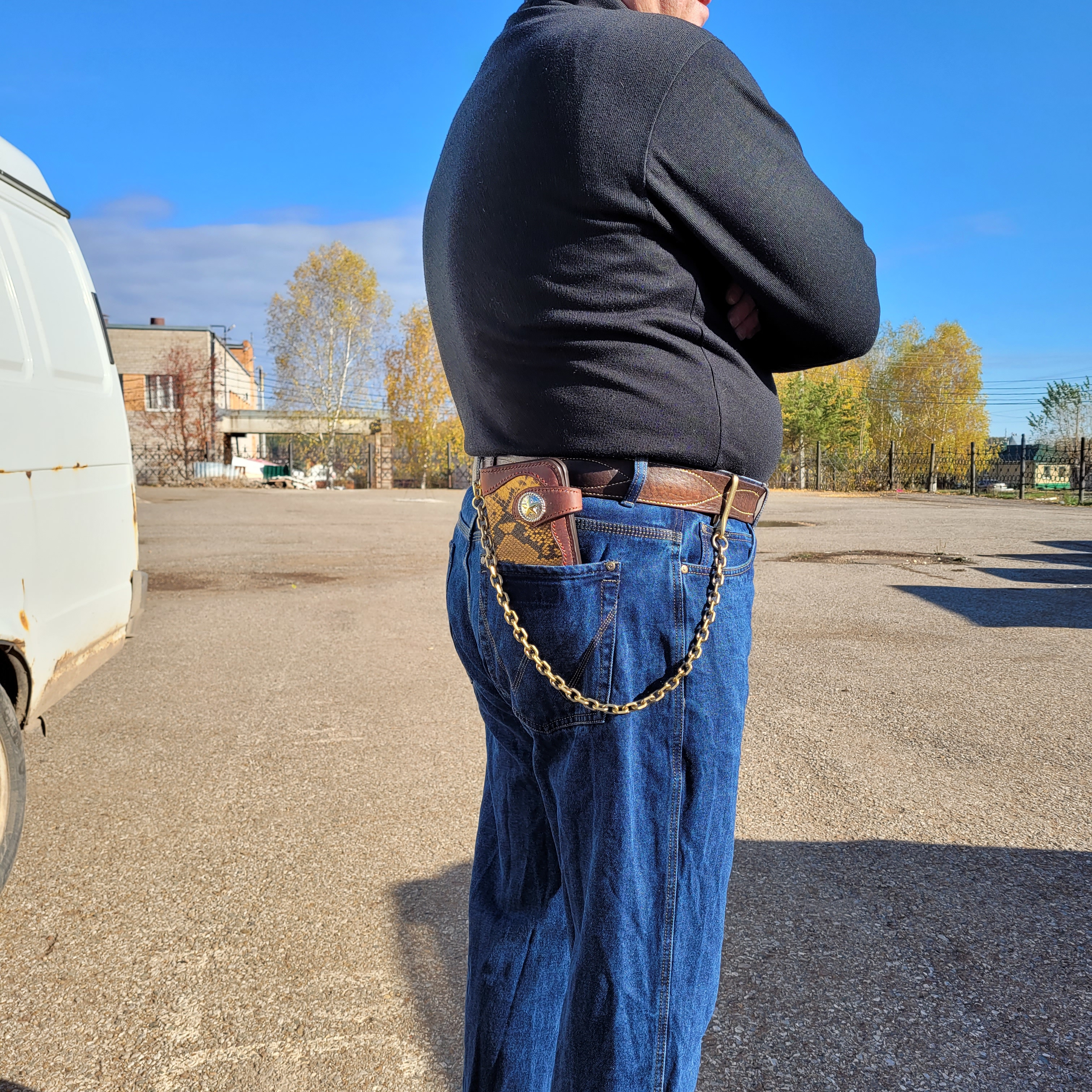 Приобрел в Leather_43 итальянскую, плотную кожу крейзи хорс растительного дубления. Первую неделю я тупо балдел от этого прекрасного запаха кожи.Решил совместить с опять же итальянской кожей змеи. Сам я эту змею не ловил, поэтому утверждать, что это змея не буду.Полностью ручная работа. Ручной шов, то есть стежок за стежком вручную, без применения швейной машины.Ручной рез выкройки без вырубных форм.Вес, только добавляет солидности этому изделию. Не смотря на некоторые особенности, кошелек полностью брутален.Фурнитура полностью цельная, литая латунь.Японские замки #5 от знаменитого производителя YYK.Вес вместе с цепочкой 50 сантиметров составляет 429 грамм.Высота составляет 195 миллиметров.Ширина 95 миллиметров.Толщина 45 миллиметров.Гуммированные итальянской краской торцы.Кончо из сплава с натуральным серебрением и позолотой.Со временем кожа покроется красивой патиной.В кошелек помещаются: 6 пластиковых карт, паспорт, есть отсеки под купюры и под мелочь.
