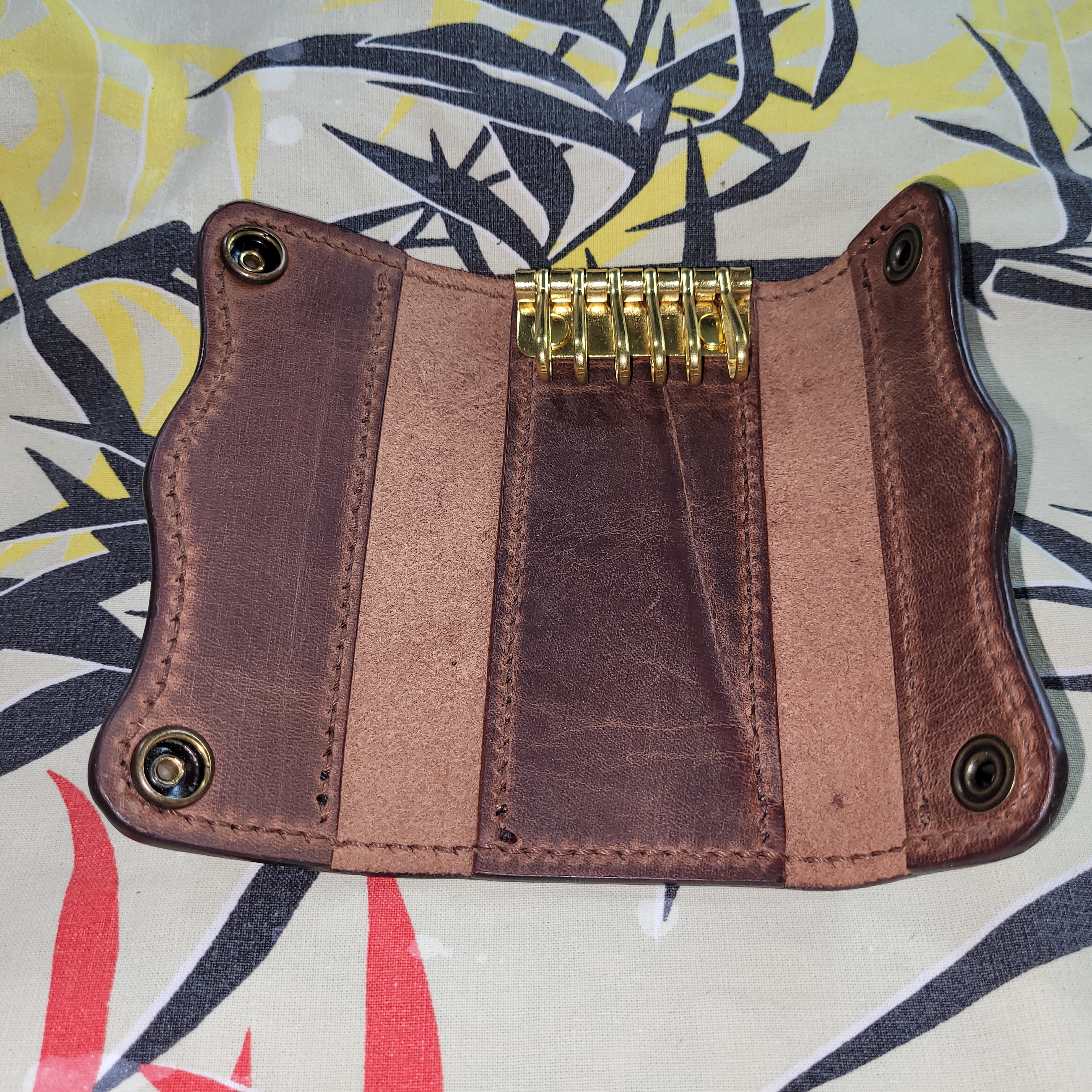 Удобная ключница защитит ваши карманы или сумку от ключей.Со временем кожа начинает приобретать глянец. Цельная латунная фурнитура.Ручной рез, без вырубных форм. Ручной шов - стежок за стежком с помощью двух швейных игл. Полностью ручное изготовление.