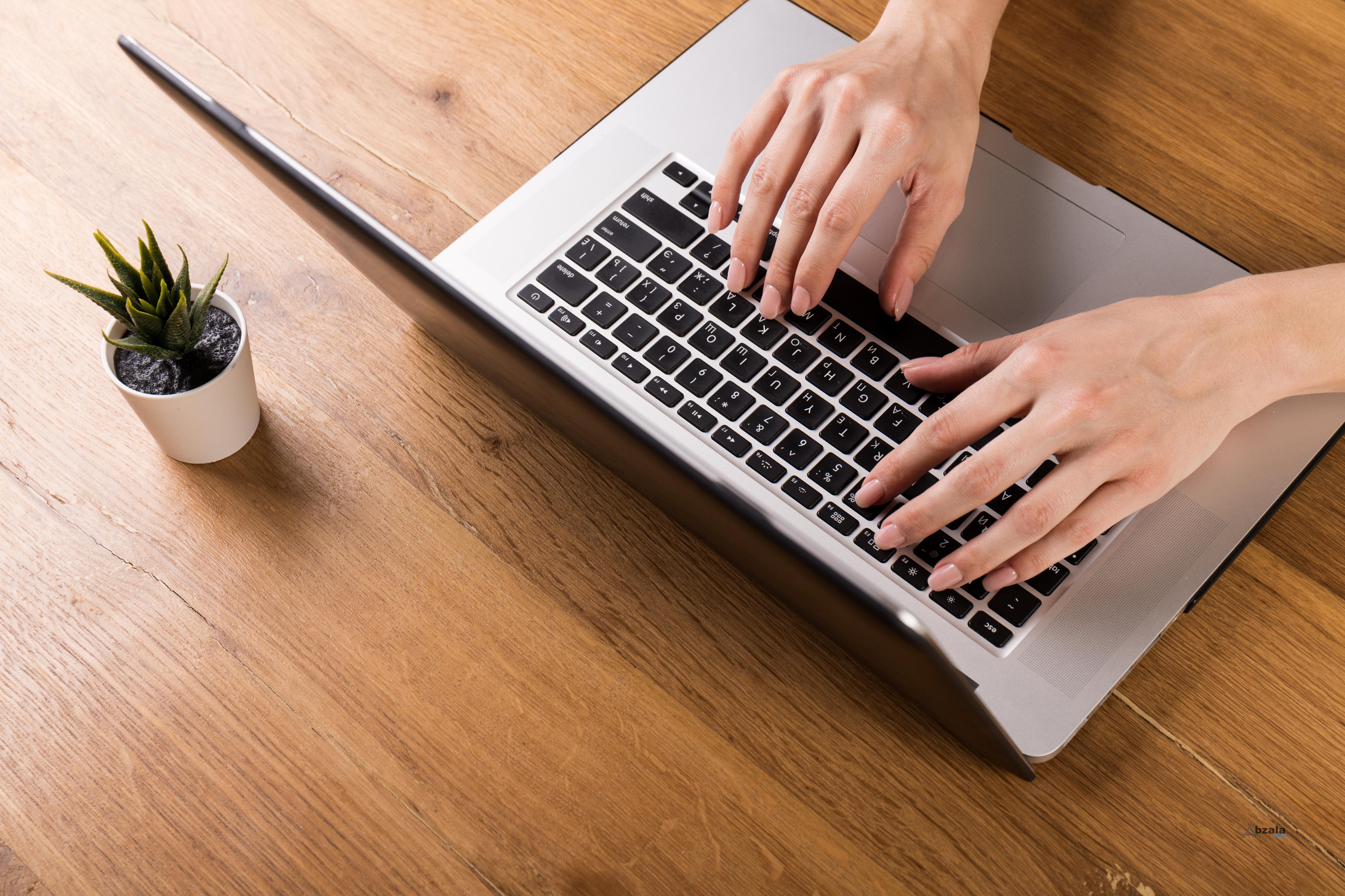 woman-working-with-laptop-on-old-wooden-table